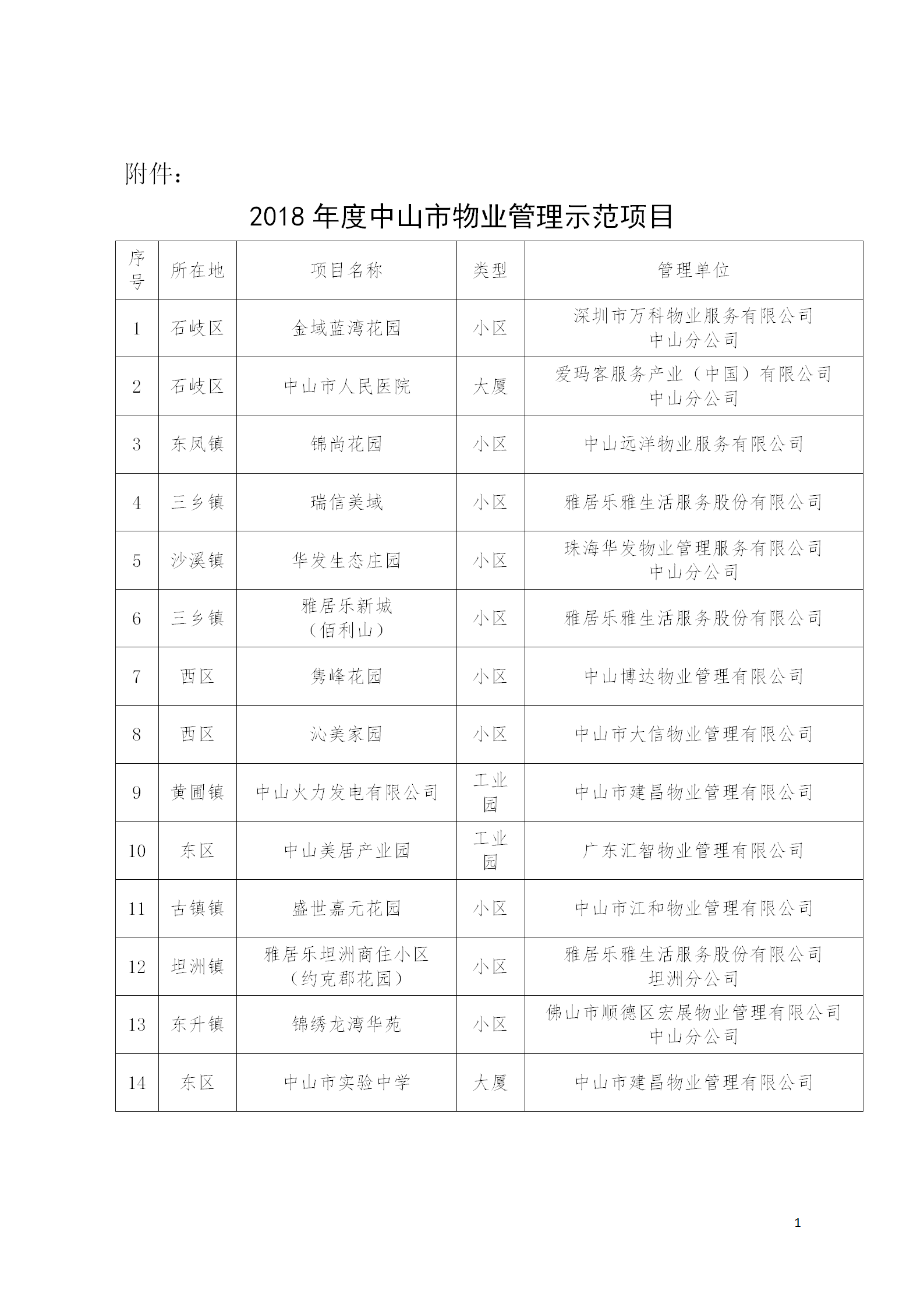 关于2018年度中山市物业管理示范项目评选结果的通报